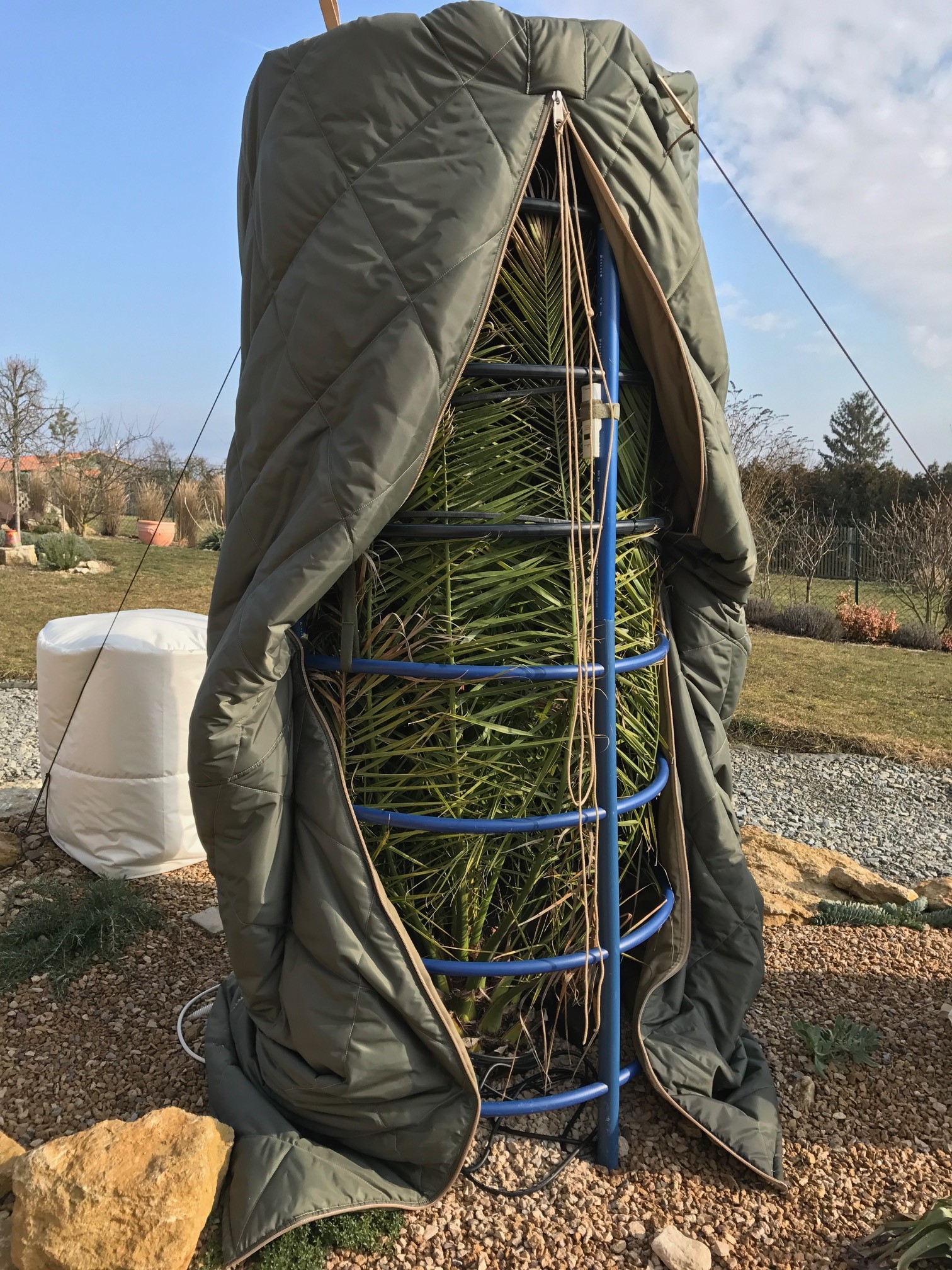 Um die Palme vital und ohne Schäden über den Winter zu bekommen, sollte man die Frosthärte nicht immer bis auf das Letzte ausreizen. Bei uns im Garten wird Phoenix can. daher nur bis -2 Grad, bestenfalls kurzeitig, über 1-2h, auch bis -4 Grad belastet. Zur Überwinterung der gut 2,3m hohen Palme werden aktuell 5 Schutzgestellmodule mit einem Innendurchmesser von 0,8m, und eine Premium Winterschutzhülle Isolation Stufe 3 mit Karoabsteppung, verwendet. Damit die Temperatur im Innenraum den erforderlichen Grenzwert nicht unterschreitet, wird ein 8m langes, selbstlimitierendes Heizband, mit einer Nennleistung von gut 150W@0Grad zur Beheizung eingesetzt. Bis zu einer Außentemperatur von ca. -15 Grad kann man mit diesem Setup die Temperatur im Innenraum halten, bzw. den Wärmeverlust der Umhüllung zur Umgebung, gut ausgleichen. Der Energieverbrauch hält sich mit den beschriebenen Komponenten also in einem recht niedrigen Bereich, und macht eine Überwinterung im Freiland durchaus vertretbar. Da eine Phoenix nur sehr wenig Frost veträgt und selbst in den mildesten Regionen Deutschlands oft beheizt werden muss, ist ein guter Winterschutz oberste Prämisse