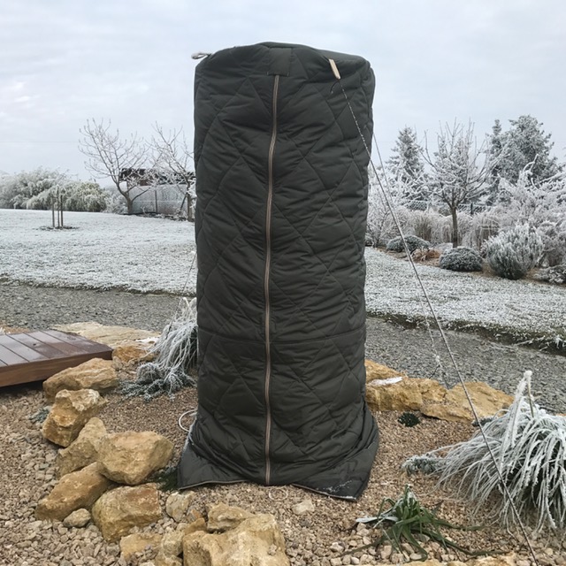 Der Winter 2018/2019 verlief insgesamt wieder äußerst mild. Nur eine Nacht war mit einem Tiefstwert von -12,8 ℃, etwas auffälliger. Geschützt wurde wieder mit der lichtdurchlässigen Hybrid Hülle. Allerdings musste der Schutz bereits auf 2,5m erhöht werden. Da unsere obere Hülle nur 2m lang ist, kam im unteren Bereich eine Verlängerung zum Einsatz.
